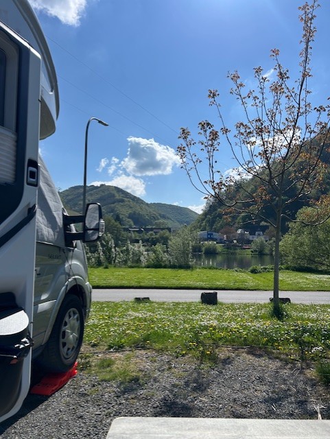 We lunchen gezellig in de camper en besluiten dan om op de camperplaats net achter de brug bij Zell te gaan staan. Deze plek ligt gelijk aan de Moezel en dat is wat wij op dit moment graag willen. Er is nog een mooi plekje in de hoek vrij en we hebben mazzel met het weer. Iedereen zal hier op zijn/haar eigen manier van genieten want een beetje zon op je lijf doet goed! Nou ja een beetje…het is lekker warm zeg maar als je activiteiten uitvoert zoals lopen en fietsen😅.