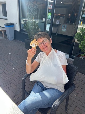 Over fietsen gesproken…dat zit er voor Wiekie even niet meer in. Afgelopen zondag struikelt zij over een drempeltje op de camping. Op dat moment ben ik net op weg om boodschappen te gaan doen in het dorp en hoor ineens mijn naam maar denk…’dat zal wel niet voor mij zijn’ en fiets verder. Even later wordt mijn naam nog veel harder geroepen en zie ik in de verte een groepje mensen staan. De schrik slaat mij om het hart. Heel snel terug naar de camping en daar zit Wiekie op de grond, lijkbleek en de pink helemaal naar buiten en naar achteren.