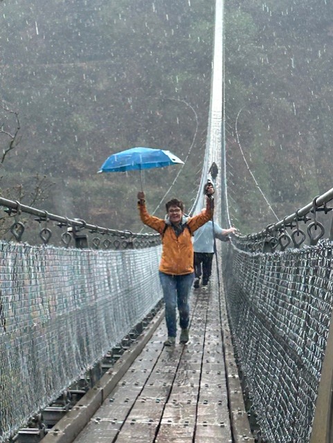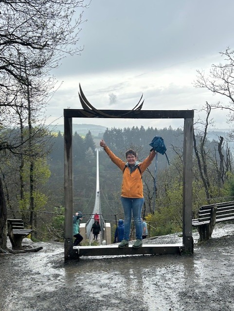 Woensdag rijden naar de Geierlay hangbrug in Mörsdorf. De brug heeft een lengte van 360 meter en is daarmee één van de langste voetgangersbruggen van Europa. De hoogte bedraagt 100 meter en het gewicht van de brug is 57 ton. Al wandelend naar deze brug begint het heel hard te regenen. Wiekie loopt desondanks een retourtje brug en Petra denkt hier nog even over na… Wel een klein stukje de brug opgegaan maar hoogtevrees speelt parten. Chapeau voor Wiekie😄.